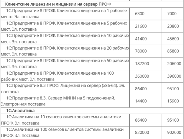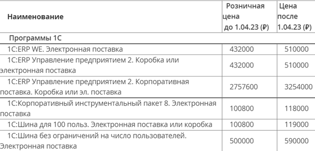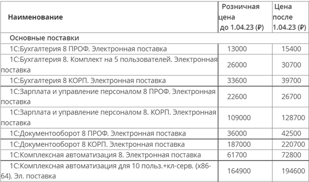 Ниже приводим примеры изменения цен на наиболее популярные типовые решения 1С с 01.04.23: